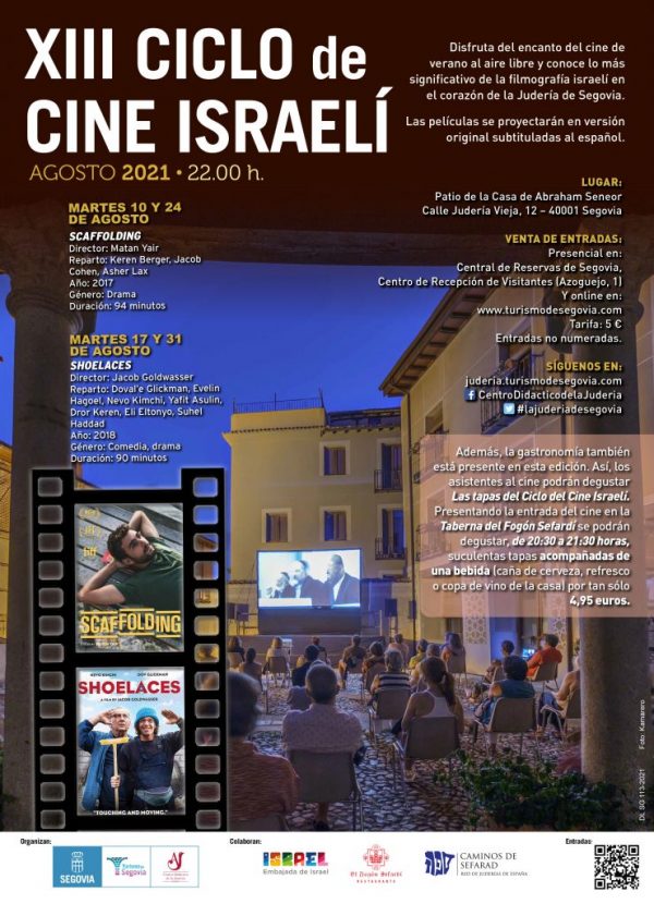 Los martes 10 y 24 de agosto se proyecta Scaffolding, de director Mattan Yair; y los martes 17 y 31 es el turno la última película del director Jacob Goldwasser: Shoeslaces. Dos exhibiciones, en días diferentes, de cada proyección para permitir el disfrute con seguridad y cumpliendo las medidas sanitarias. La cita será a las 22:00 horas. Todas las películas se proyectarán en versión original con subtítulos en español. Las entradas, con un precio de 5 euros, pueden adquirirse a través de www.turismodesegovia.com y en el Centro de Recepción de Visitantes (Azoguejo).