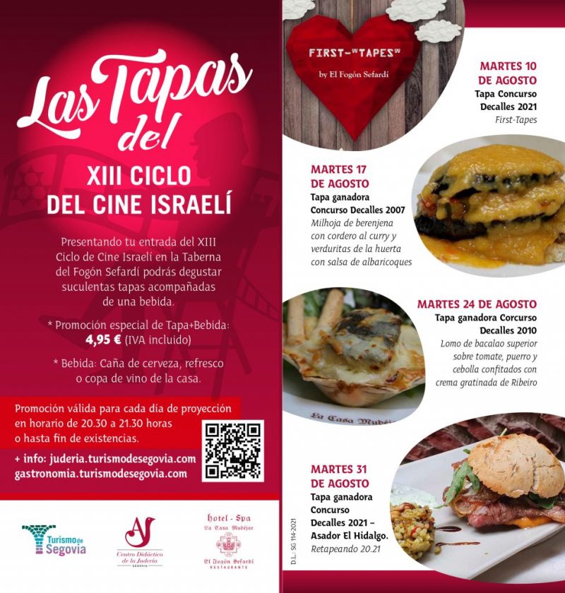 Además, la gastronomía también está presente en esta edición. Así, los asistentes al cine podrán degustar Las tapas del Ciclo del Cine Israelí. Presentando la entrada del cine en la Taberna del Fogón Sefardí se podrán degustar, de 20:30 a 21:30 horas, suculentas tapas acompañadas de una bebida (caña de cerveza, refresco o copa de vino de la casa) por tan sólo 4,95 euros.