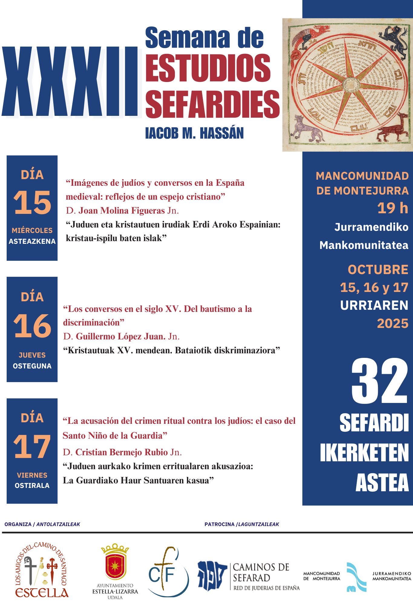 La asociación Amigos del Camino de Santiago organiza la edición número 32 de la Semana de Estudios Sefardíes, para MIÉRCOLES, JUEVES Y VIERNES, días 15, 16 y 17 de este mes, a las 7 de la tarde en el salón de actos de la Mancomunidad de Montejurra. El colectivo que preside Maxi Ruiz de Larramendi aclara que el ciclo tiene « un carácter estrictamente cultural e histórico ». « Su objetivo es profundizar en el conocimiento y la memoria de los sefardíes descendientes de quienes fueron expulsados de la Península Ibérica a finales de la Edad Media, sin relación ni vinculación alguna con la coyuntura política o conflictos contemporáneos. Con este recordatorio, reafirmamos nuestro compromiso con el espíritu de diálogo, estudio y respeto que ha guiado siempre estas jornadas ».