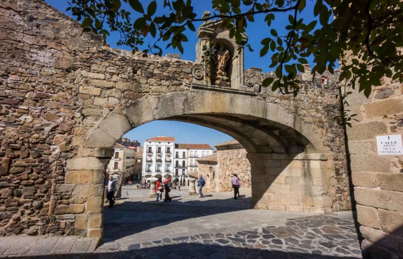 Al otro lado del Cáceres monumental está la Judería Nueva, a la que se puede entrar a través de otro arco, este aún más modesto, que une la Plaza Mayor con la calle Paneras. Este asentamiento tan provisional -estuvo ocupado sólo durante catorce años, si bien algunos judíos decidieron quedarse al dictarse la expulsión en 1492- contó también con su sinagoga, justo en el solar en el que poco después, pero ya en el siglo XVI, se construyó el espléndido Palacio de la Isla, una joya renacentista. Y también hubo, en algún momento, viviendas de familias judías junto a un tercer arco, el de la Estrella en la Plaza Mayor. En todos estos lugares se pueden encontrar ahora las marcas de la Red de Juderías de España, símbolos de cómo Cáceres quiere recuperar, ahora sí con orgullo, ese hermoso pasado sefardí.