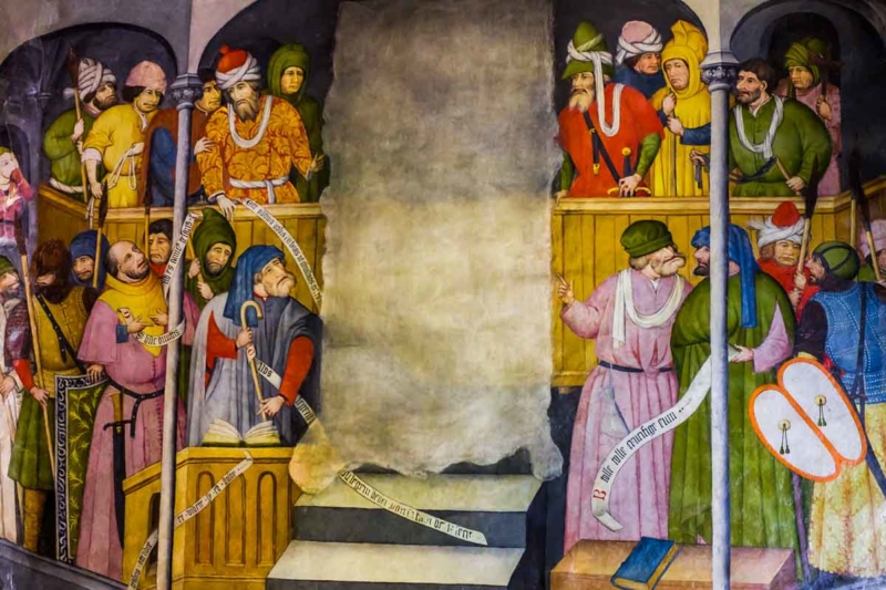 Por último, el viajero curioso no puede dejar de visitar la Catedral, para empezar porque es un templo excepcional y uno de los grandes tesoros del gótico español, pero en relación al tema que nos ocupa por las pinturas en la girola del templo, que representan a un grupo de judíos con vestimentas propias del siglo XV -las pinturas son de mitad de esa centuria- en lo que es una ilustración excelente de cómo debía ser la presencia sefardí en esa época, en la que ya se acercaba a su final.