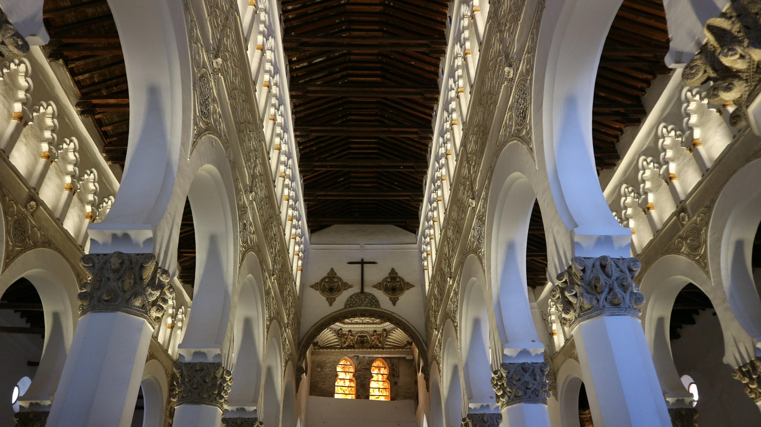 A sólo dos minutos a pie está otra verdadera maravilla: Santa María la Blanca, una sinagoga un poco más modesta en cuanto a sus proporciones pero aún más antigua, de finales del siglo XII, y desde luego no menos bella, con su entramado de columnas y arcos de herradura que añaden un toque aún más arabeizante a su estilo mudéjar.