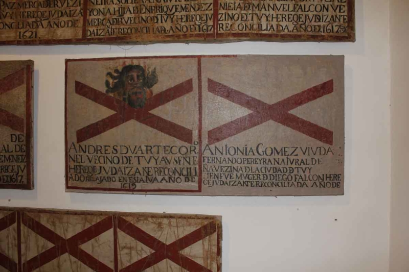 No obstante, el más singular de los tesoros relacionados con el pasado sefardí de Tui -aunque esta sea una relación bien triste- son los sambenitos que se conservan en la catedral, únicos en toda Europa. Son una colección de cinco lienzos en los que se nombra a 14 penitenciados entres los años 1617 y 1621. Dos de ellos son aún más especiales, si cabe: los de Antonia Henríquez y su hijo Andrés Duarte Coronel, que huyeron de la acción inquisitorial y por tanto fueron quemados en estatua y en el sambenito aparece un amenazante rostro ardiendo.